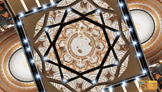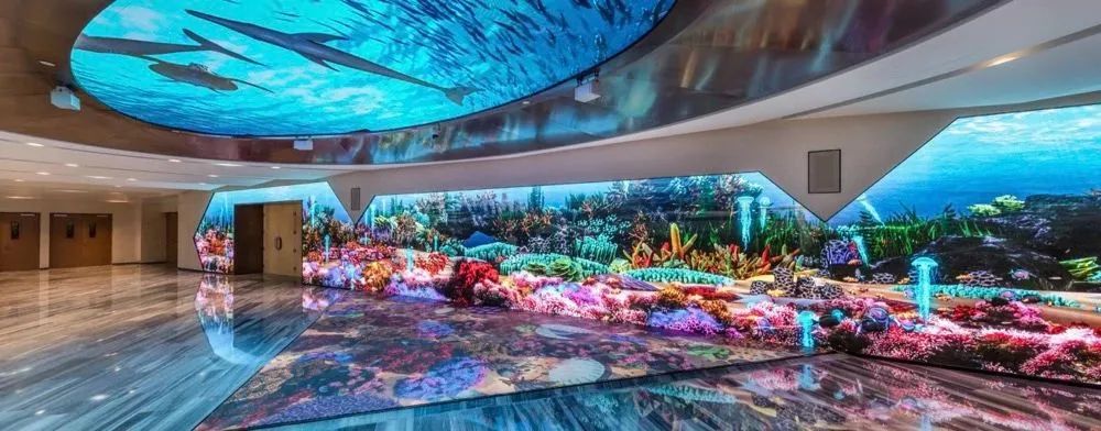 宴会厅前厅:配备了房顶、墙壁和地面融合组成的巨型交互式屏幕。使用星空(中国)VED系列P2.5LED小间距屏幕,不仅能完美地呈现各种特效,还可结合虚拟现实技术来使用。